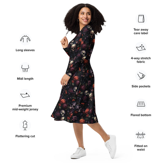 Gothic Skulls & Flowers | Long Sleeve Midi Length Dress | Witchy Dress